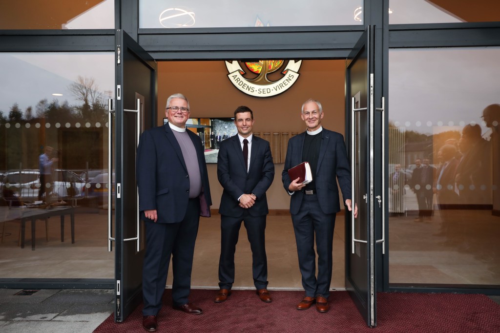 Rev Peter McIntyre, Builder Lester Weir and Free Presbyterian Moderator Rev John Armstrong open the doors of new meeting house of Clogher Valley Free Presbyterian Church